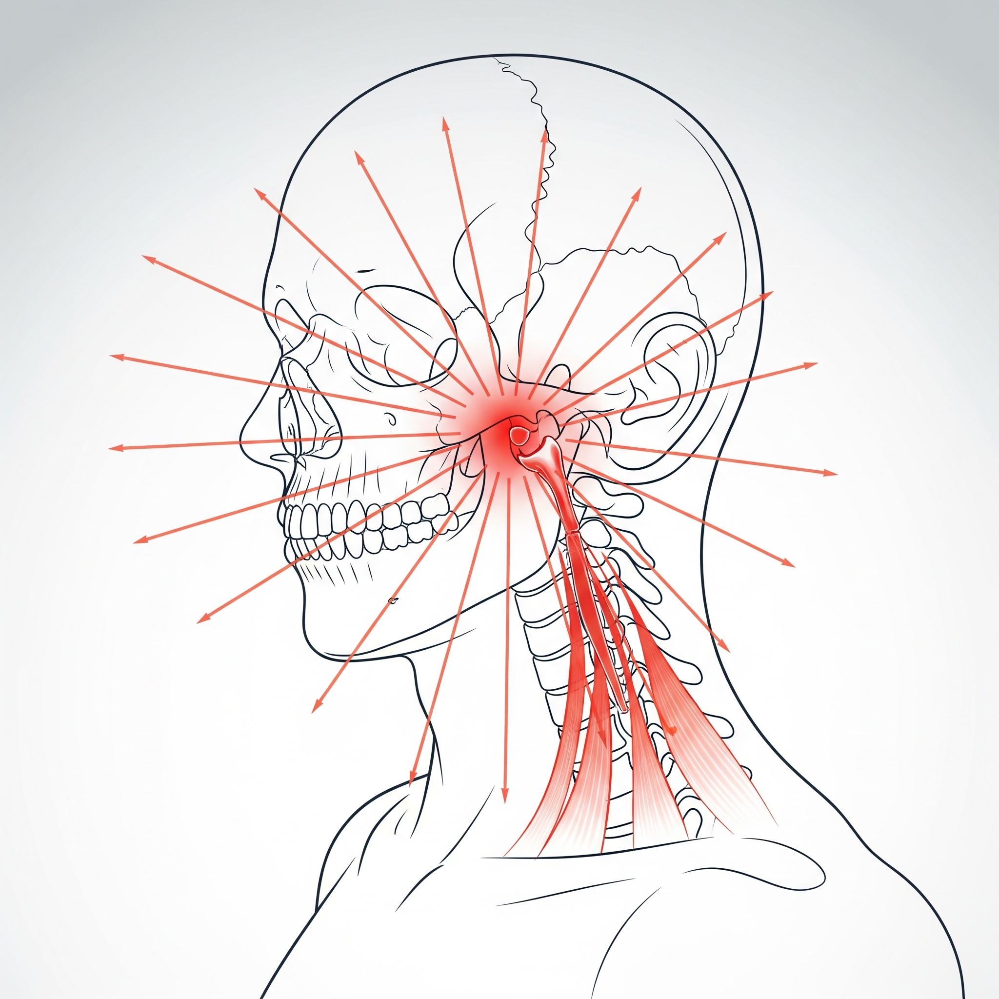 1. I muscoli masticatori iperattivi (massetere, temporale, pterigoideo) creano tensioni che si irradiano verso i muscoli del collo